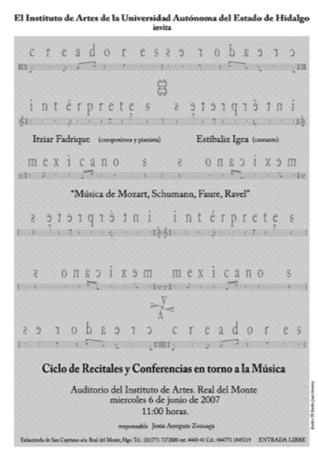Al Lic. Juan Randell Badillo, Director del IDA y al Secretario Académico Mtro. Tomas Herrera, constantes asistentes al Ciclo, se les agradece la presentación que hicieron de los músicos y conferencistas a lo largo de todo el Ciclo de Recitales y Conferencias en torno a la Música, Creadores e Intérpretes Mexicanos.